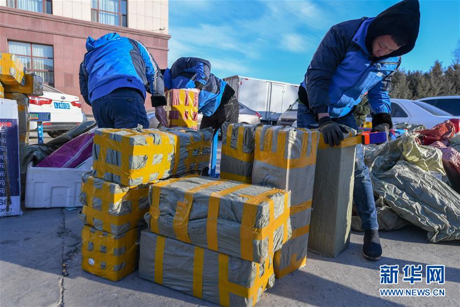 12月27日,在吉林松原查干湖漁場(chǎng),快遞員將魚打包準(zhǔn)備發(fā)給客戶。 新華社記者張楠攝