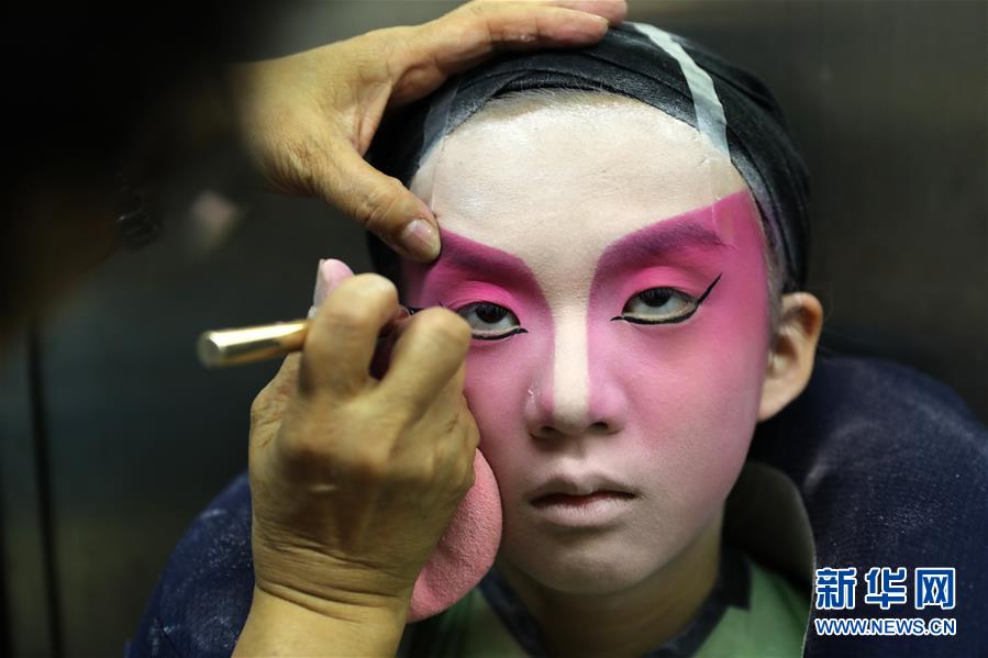 粵劇小演員陸瑞徽在畫經(jīng)典“紅白臉”妝容(6月8日攝)。 聲輝粵劇推廣協(xié)會成立于2003年,是香港重要粵劇藝術(shù)團體之一,致力于向青少年推廣粵劇。協(xié)會目前有兩個初班,3個中班,一個青少年班?;泟∮址Q“廣東大戲”,表演技藝包括“唱做念打”,即唱功、身段、臺詞、武打,主要流行于廣東、廣西和香港、澳門等地區(qū)。2009年,粵劇被列入聯(lián)合國教科文組織人類非物質(zhì)文化遺產(chǎn)代表作名錄,今年正逢十周年。 新華社記者 吳曉初 攝