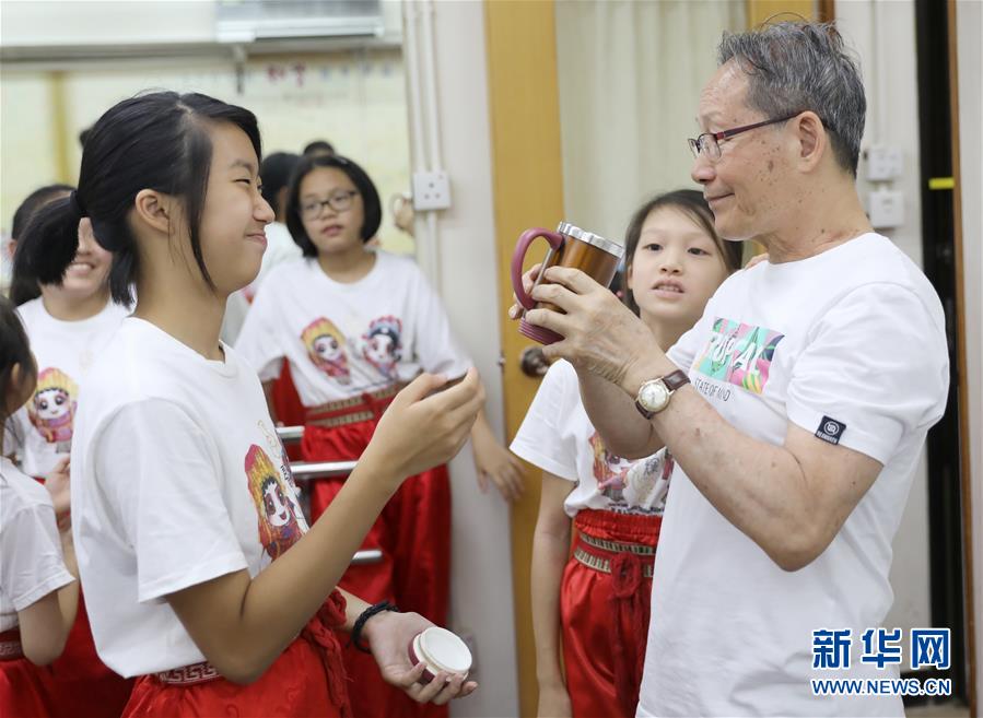 孩子們給79歲的粵劇名伶楊劍華敬茶(6月8日攝)。 聲輝粵劇推廣協(xié)會成立于2003年,是香港重要粵劇藝術(shù)團體之一,致力于向青少年推廣粵劇。協(xié)會目前有兩個初班,3個中班,一個青少年班。粵劇又稱“廣東大戲”,表演技藝包括“唱做念打”,即唱功、身段、臺詞、武打,主要流行于廣東、廣西和香港、澳門等地區(qū)。2009年,粵劇被列入聯(lián)合國教科文組織人類非物質(zhì)文化遺產(chǎn)代表作名錄,今年正逢十周年。 新華社記者 吳曉初 攝