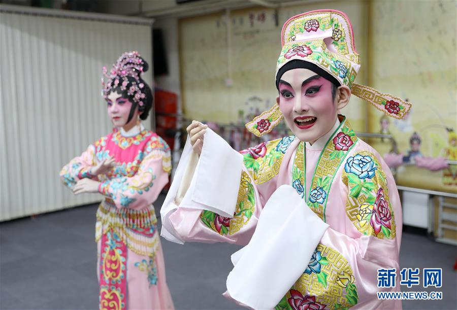 陸瑞徽(左)和利文喆在表演折子戲《艷曲醉周郎》(6月8日攝)。 聲輝粵劇推廣協(xié)會成立于2003年,是香港重要粵劇藝術(shù)團體之一,致力于向青少年推廣粵劇。協(xié)會目前有兩個初班,3個中班,一個青少年班?;泟∮址Q“廣東大戲”,表演技藝包括“唱做念打”,即唱功、身段、臺詞、武打,主要流行于廣東、廣西和香港、澳門等地區(qū)。2009年,粵劇被列入聯(lián)合國教科文組織人類非物質(zhì)文化遺產(chǎn)代表作名錄,今年正逢十周年。 新華社記者 吳曉初 攝