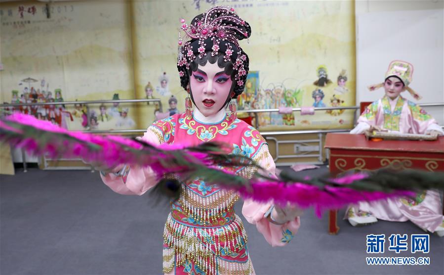 粵劇小演員陸瑞徽在準(zhǔn)備折子戲《艷曲醉周郎》的表演(6月8日攝)。 聲輝粵劇推廣協(xié)會成立于2003年,是香港重要粵劇藝術(shù)團體之一,致力于向青少年推廣粵劇。協(xié)會目前有兩個初班,3個中班,一個青少年班。粵劇又稱“廣東大戲”,表演技藝包括“唱做念打”,即唱功、身段、臺詞、武打,主要流行于廣東、廣西和香港、澳門等地區(qū)。2009年,粵劇被列入聯(lián)合國教科文組織人類非物質(zhì)文化遺產(chǎn)代表作名錄,今年正逢十周年。 新華社記者 吳曉初 攝