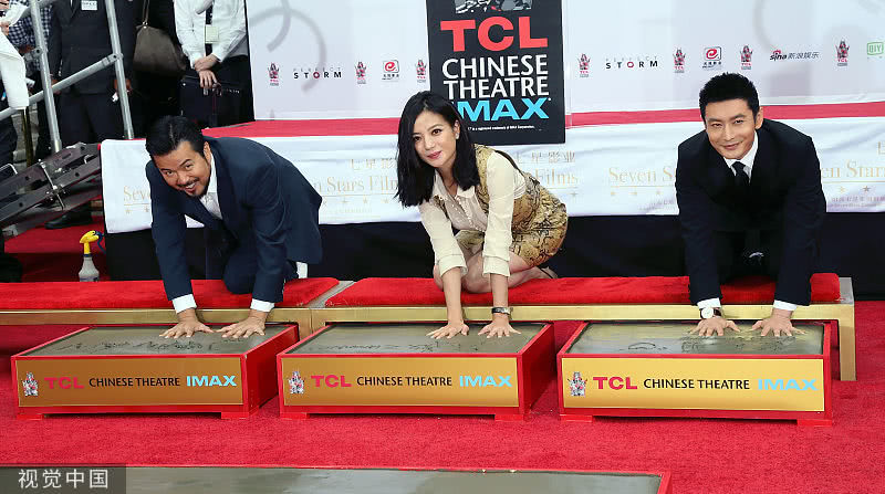 趙薇和黃曉明在好萊塢TCL中國(guó)大劇院門前按下象征世界電影人無上榮譽(yù)的手印,在該地留印的華人明星只有三個(gè),分別是成龍、吳宇森和馮小剛。