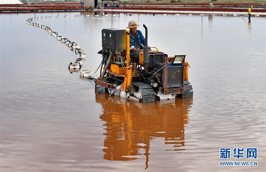 7月2日,唐山海港經(jīng)濟開發(fā)區(qū)大清河鹽場的工人在操作機械設備收獲春鹽。新華社記者 楊世堯 攝