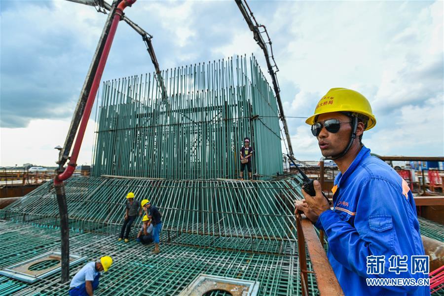 中鐵大橋局施工人員在湛江調(diào)順跨海大橋西岸主塔墩承臺綁扎鋼筋(7月6日攝)。 湛江調(diào)順跨海大橋的東岸主塔墩承臺日前順利建成,大橋步入主塔塔柱施工階段。調(diào)順跨海大橋?yàn)閺V東省重點(diǎn)工程,大橋跨越湛江灣連接湛江市調(diào)順島及海東新區(qū),主橋?yàn)殡p塔雙索面斜拉橋,主塔高136.9米,全長約9.36公里。 新華社記者 劉大偉 攝