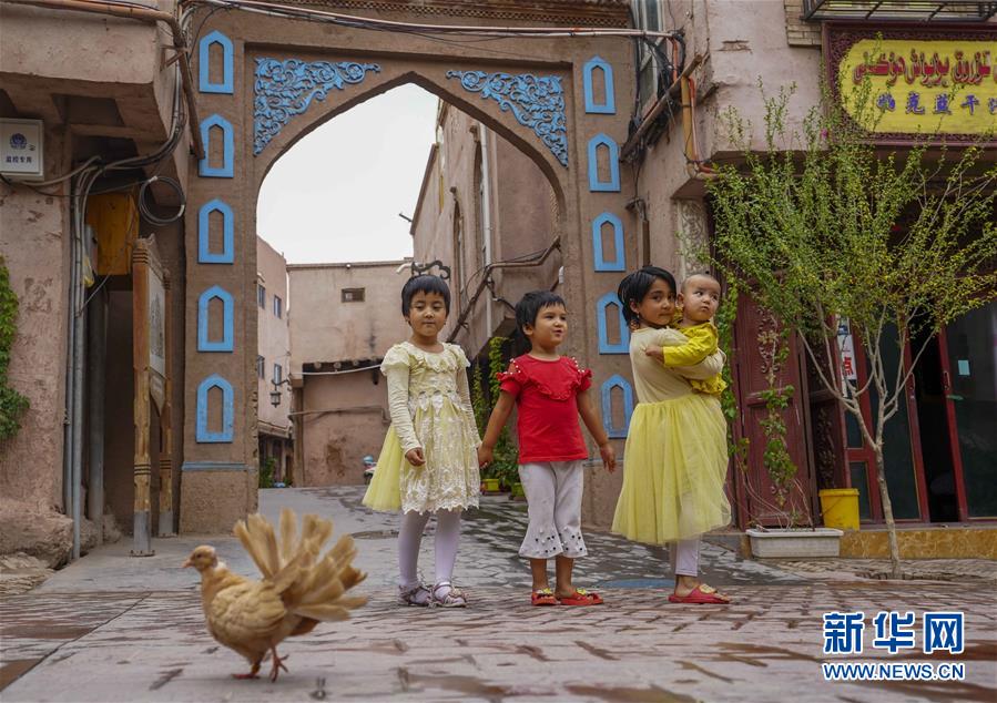 7月7日,小朋友在雨中的喀什古城景區(qū)玩耍。 新華社記者 趙戈 攝