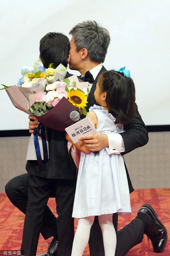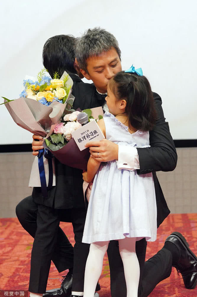 2019年7月11日,上海,鄧超新片《銀河補(bǔ)習(xí)班》上海首映,孫儷帶著等等、小花前來(lái)助陣,現(xiàn)場(chǎng)的鄧超一看就是個(gè)女兒奴,在現(xiàn)場(chǎng)和目光都不離開(kāi)小花,又是親親抱抱,又是單膝跪地安撫,十足疼愛(ài)這位前世小情人。