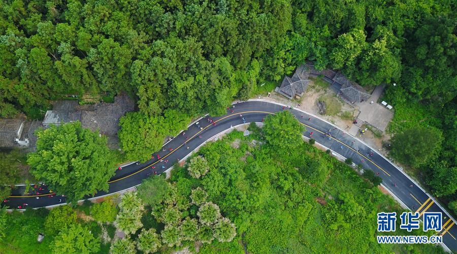 參加首屆丹霞山半程馬拉松的選手們?cè)诹珠g穿梭(2018年5月27日無人機(jī)拍攝)。 新華社記者 鄧華 攝