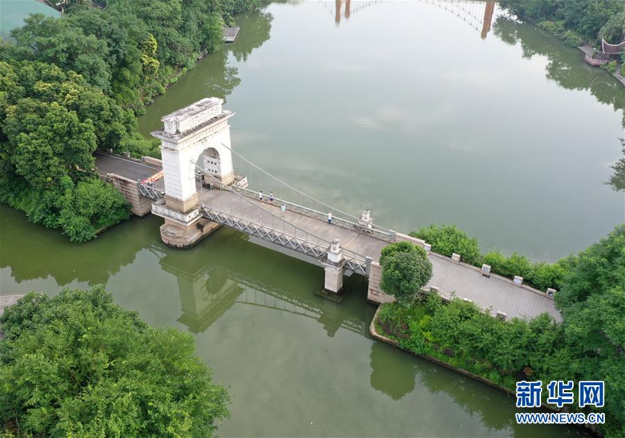桂林市榕湖上的橋梁(7月1日無(wú)人機(jī)拍攝)。 夏日時(shí)節(jié),廣西桂林市區(qū)內(nèi)的榕湖、杉湖、桂湖、木龍湖等地綠樹(shù)成蔭、景色迷人。 新華社記者陸波岸攝