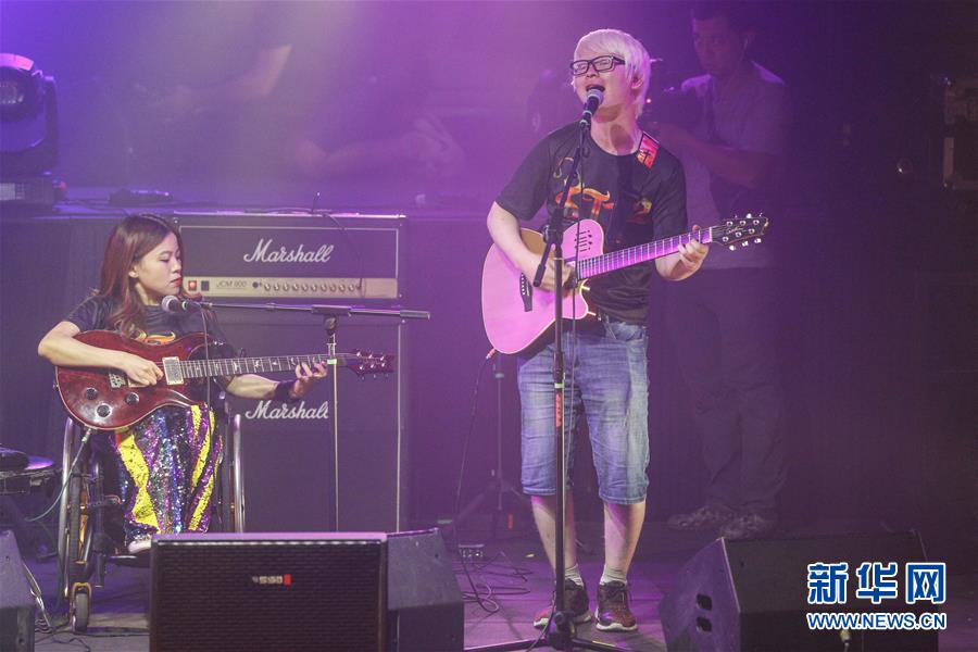8月14日,8772樂隊(duì)成員謝航程(右)和程利婷在演唱會(huì)上表演。新華社記者張玉薇攝