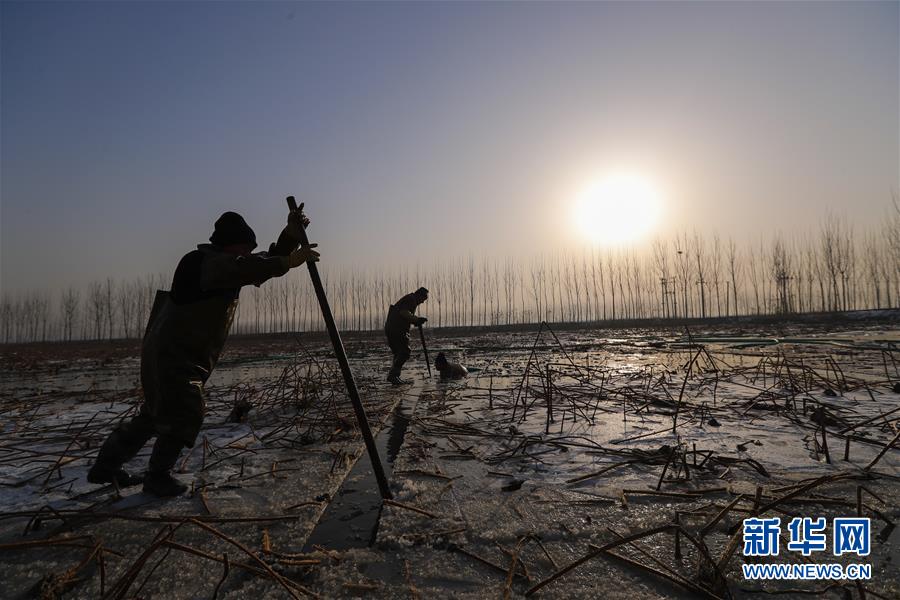 白洋淀深冬挖藕人