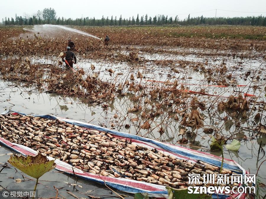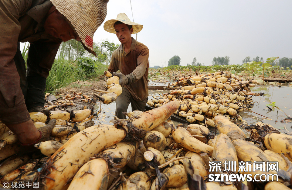 藕農(nóng)們抓緊采藕、清洗、包裝、運(yùn)輸,以供應(yīng)市場(chǎng)。