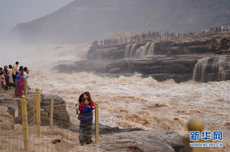 10月17日,游客在位于陜西宜川縣的黃河壺口瀑布岸邊合影。 新華社記者邵瑞攝