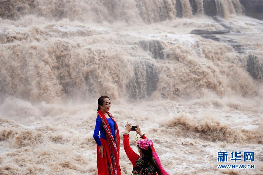 7月19日,游客在山西境內的壺口瀑布群前留影。 新華社記者陶明 攝