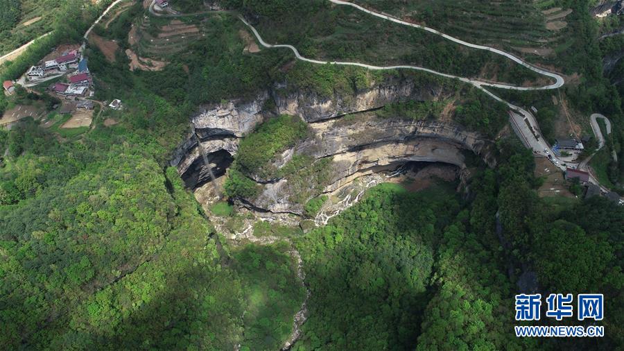 4月22日無人機(jī)拍攝的地洞河天坑。 新華社記者 張博文 攝