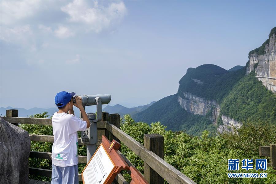 游客在重慶金佛山風景區(qū)用望遠鏡觀景(8月20日攝)。 新華社記者 劉潺 攝