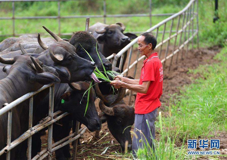 在廣西融安縣大良鎮(zhèn)古蘭村古蘭屯養(yǎng)牛基地,68歲的韋肇翠在喂牛(8月18日攝)。韋肇翠是養(yǎng)?;氐娘曫B(yǎng)員,每個(gè)月有2800元的工資。 新華社記者 黃孝邦 攝