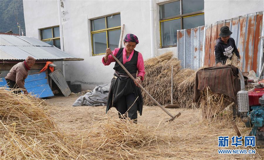乃村村民抓緊好天氣打場(chǎng)收糧(8月26日攝)。 新華社記者 多吉占堆 攝