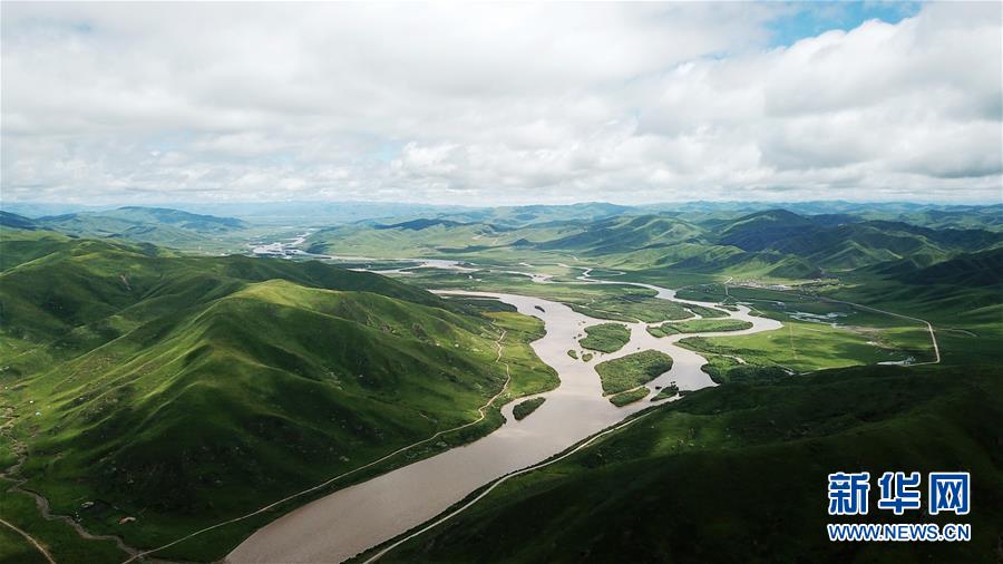 黃河流經(jīng)的甘肅省甘南藏族自治州瑪曲縣境內(nèi)濕地和草原(6月23日無人機拍攝)。新華社記者 陳斌 攝