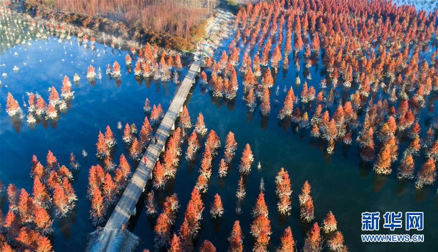 云南昆明水杉濕地冬日一景(1月5日無(wú)人機(jī)拍攝)。 新華社記者 秦晴 攝