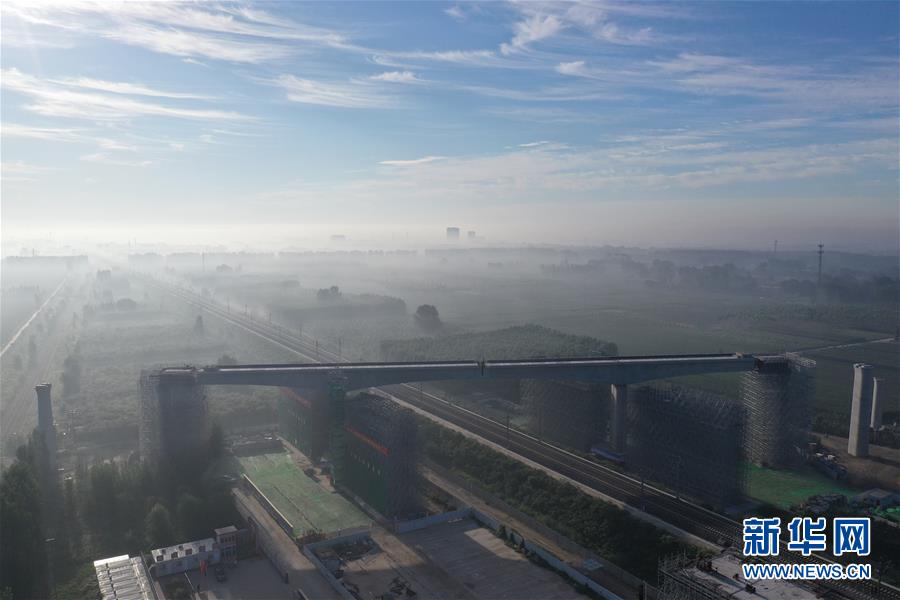這是8月27日晨無人機(jī)拍攝的轉(zhuǎn)體完成的橋梁。 新華社記者 邢廣利 攝