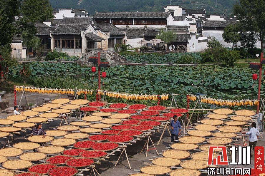 秋天,是收獲的季節(jié)。安徽省黃山市呈坎古村村民將收獲歸倉的玉米、黃豆、紅辣椒等農(nóng)作物果實因地制宜晾曬,在古村曬場上描繪出一幅豐收曬秋圖。