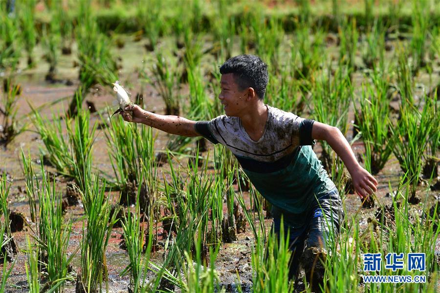 10月28日,在廣西融水苗族自治縣拱洞鄉(xiāng)龍令村,一名少年參加抓魚比賽。新華社記者 黃孝邦 攝