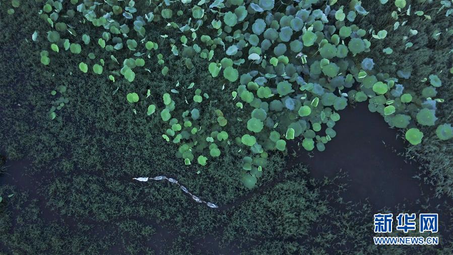 這是8月4日無人機拍攝的安徽黟縣宏村風景區(qū)附近的荷塘。新華社記者張端攝