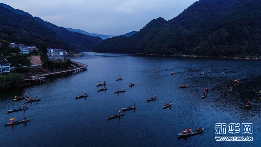 9月25日,在宋村鄉(xiāng)云源港的水面上,漁民劃著漁船,船頭點(diǎn)亮漁燈,構(gòu)成一幅“漁舟唱晚、萬家燈火”的美麗圖景,與沿湖民宿群落交相輝映(無人機(jī)拍攝)。  新華社記者 徐昱 攝