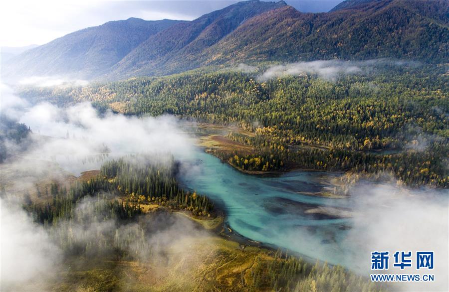 9月24日無人機(jī)拍攝的喀納斯景區(qū)風(fēng)光。 新華社記者 王菲 攝