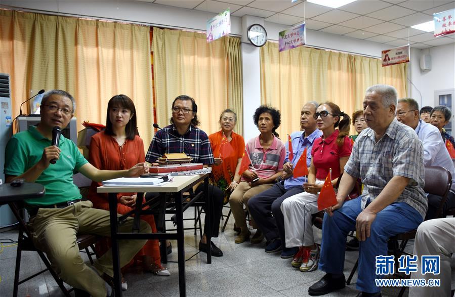 10月1日,在天津市和平區(qū)昆明路社區(qū)黨群服務中心,天津“心目影院”創(chuàng)始人鄭偉(左一)和兩位講解員在為視障人士“直播”慶祝中華人民共和國成立70周年大會的盛況。當日是國慶節(jié),全國各地的人們用各種方式歡度節(jié)日。新華社記者 宋瑞 攝