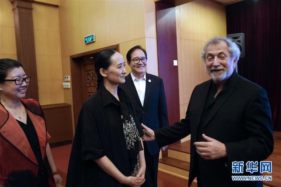 10月2日,芭蕾編舞大師鮑里斯·艾夫曼(右一)與第四屆中國國際芭蕾演出季藝術(shù)總監(jiān)馮英(左二)在演出前交流。新華社記者 金良快 攝