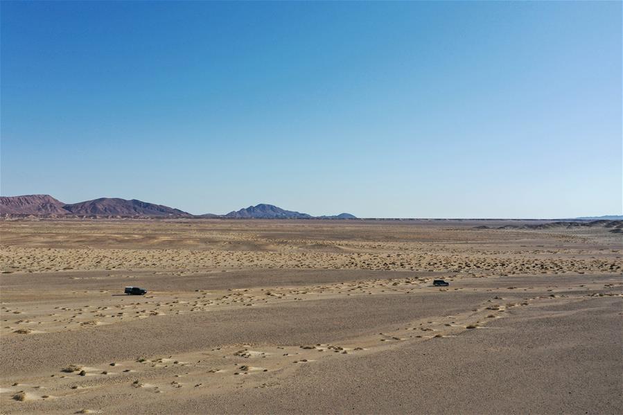 9月25日,內(nèi)蒙古自治區(qū)額濟(jì)納旗算井子邊境派出所的民警開(kāi)車對(duì)轄區(qū)進(jìn)行巡護(hù)(無(wú)人機(jī)拍攝)。新華社記者劉磊攝