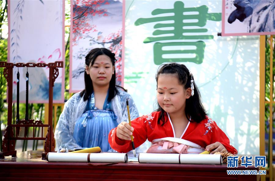 10月3日,在河北邯鄲市磁縣方特主題公園內(nèi),游客在練習(xí)書法。 當(dāng)日是國(guó)慶假期第三天,人們紛紛走出家門,樂(lè)享假期。 新華社記者 王曉 攝