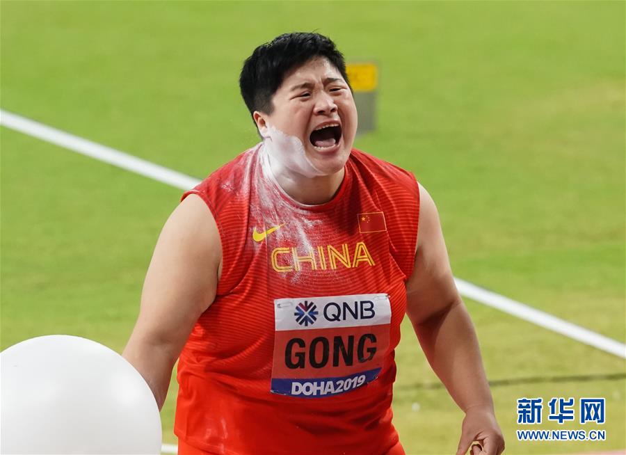 當(dāng)日,在卡塔爾多哈舉行的2019國際田聯(lián)世界田徑錦標賽女子鉛球決賽中,衛(wèi)冕冠軍、中國選手鞏立姣以19米55的成績奪得冠軍。 新華社記者王婧嬙攝