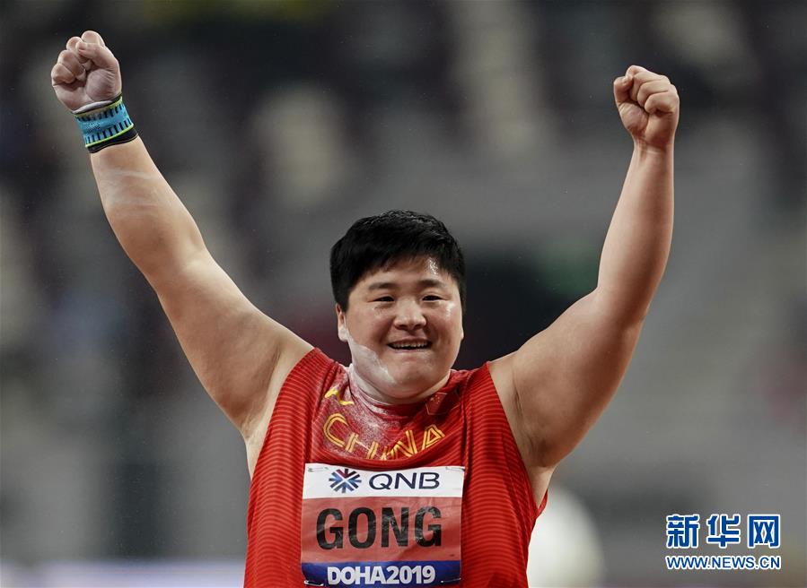 當日,在卡塔爾多哈舉行的2019國際田聯(lián)世界田徑錦標賽女子鉛球決賽中,衛(wèi)冕冠軍、中國選手鞏立姣以19米55的成績奪得冠軍。 新華社記者李鋼攝