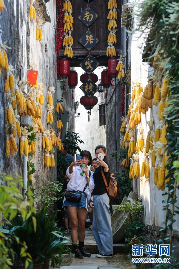 10月5日,游客在新葉古村的巷子內(nèi)觀賞美景。新華社記者徐昱攝