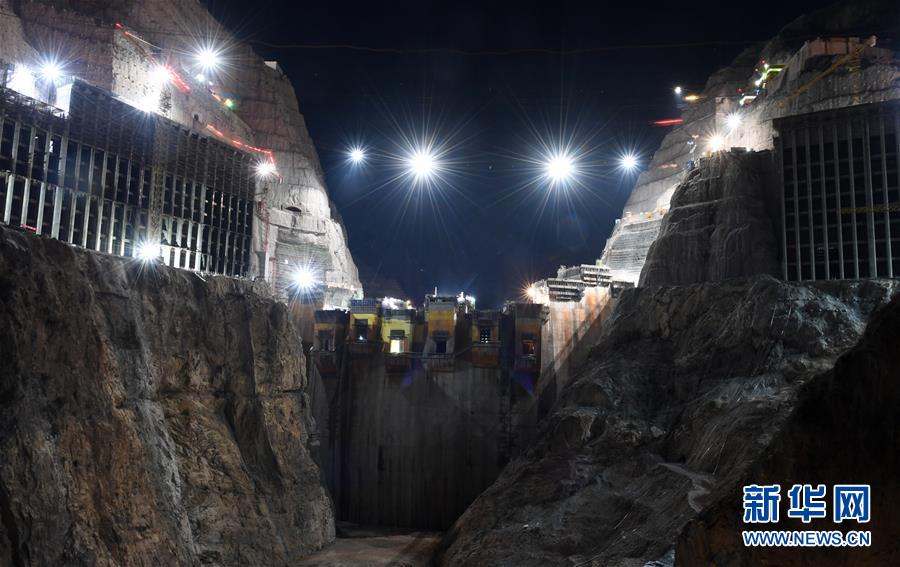 這是正在緊張施工的烏東德水電站大壩主體工程夜景(5月31日攝)。新華社記者陳曄華攝