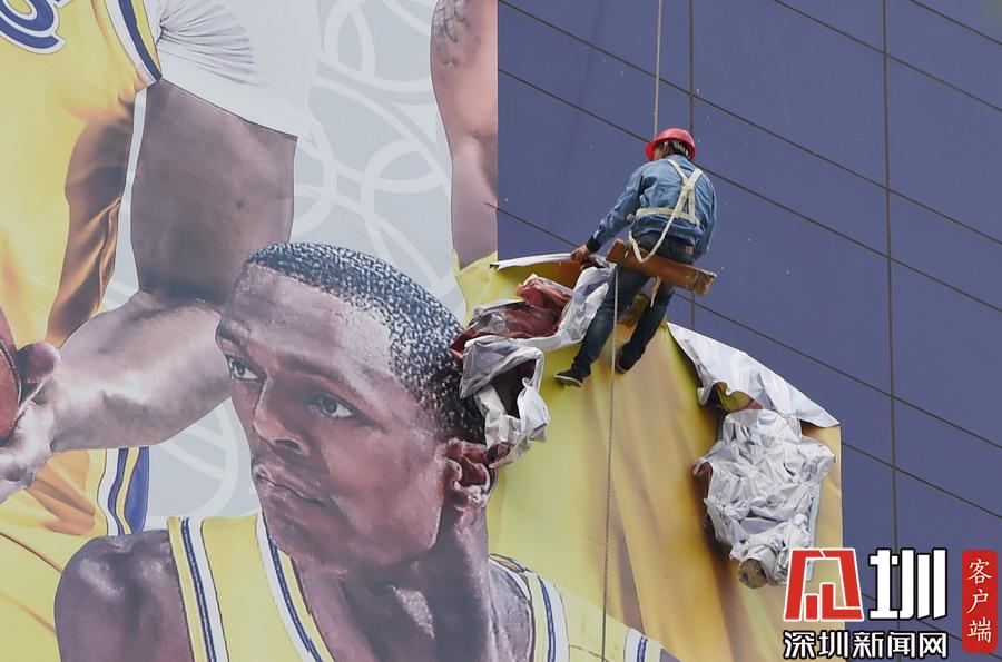 2019年10月9日,上海,“2019NBA球迷之夜”取消,上海正大廣場(chǎng)外圍巨幅NBA中國(guó)賽海報(bào)被拆除。