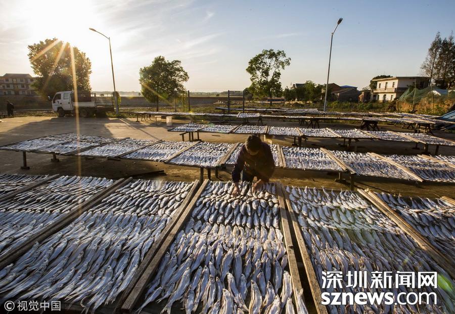 江西都昌縣薌溪鄉(xiāng)的漁民趁著晴好天氣翻曬捕撈上岸的魚蝦。