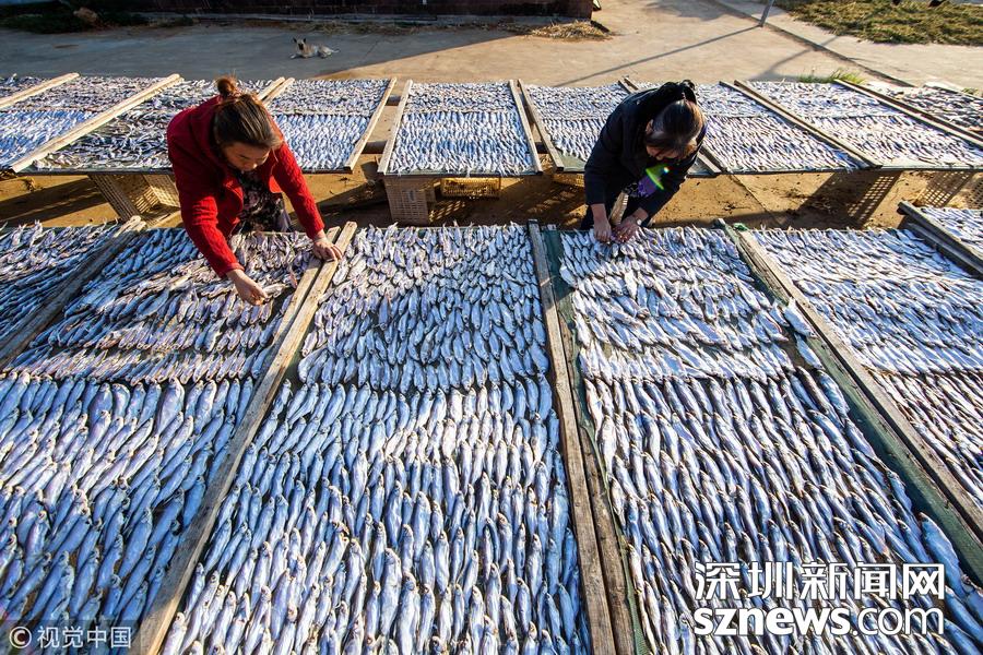 鄱陽湖畔漁民趁秋光晾魚蝦