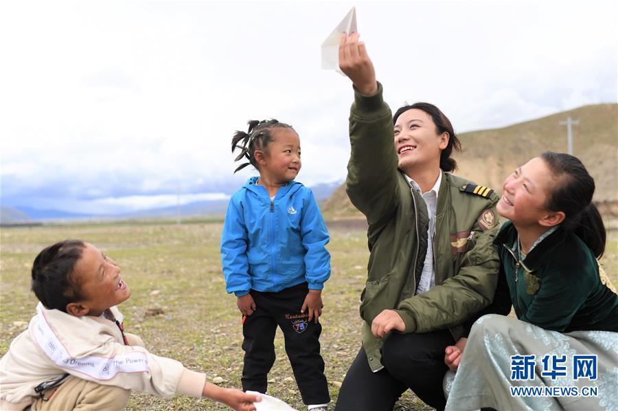 堅(jiān)熱益西(右二)在牧區(qū)和弟弟妹妹一起放飛紙飛機(jī)(7月13日攝)。新華社記者普布扎西攝