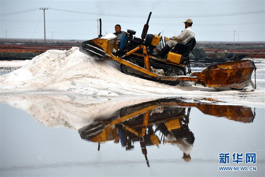 魯北鹽場工人在鹽池中收獲海鹽(10月9日攝)。新華社記者 朱崢 攝