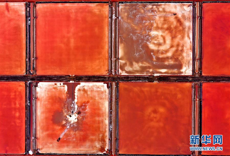 魯北鹽場工人在鹽池中收獲海鹽(10月9日無人機拍攝)。新華社記者 朱崢 攝