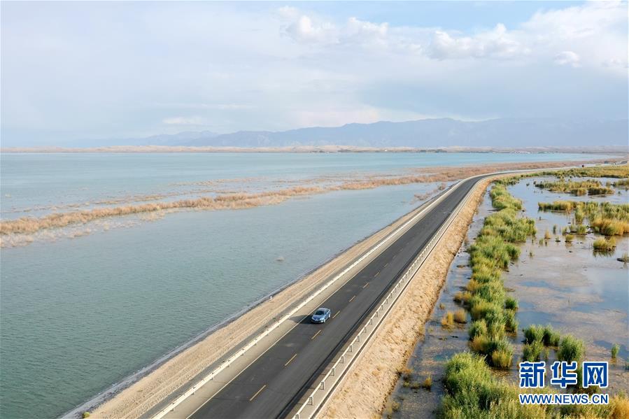 這是新疆博斯騰湖河堤公路(10月12日無(wú)人機(jī)拍攝)。入秋以來(lái),新疆博斯騰湖碧波蕩漾,美景如畫,吸引各地游客前來(lái)游玩。新華社記者丁磊 攝