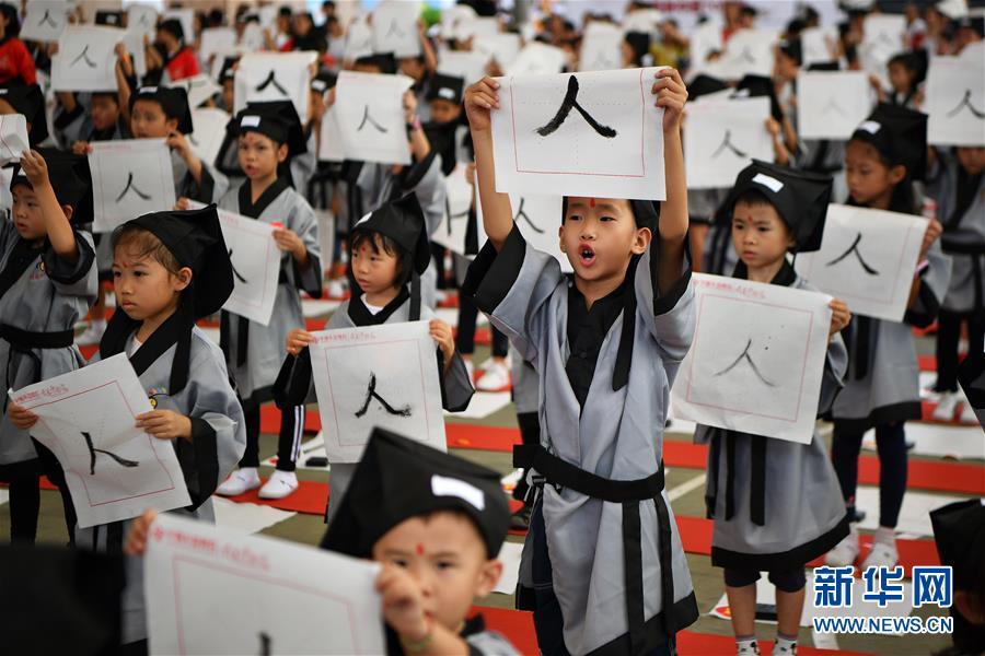 10月13日,參加儀式的小朋友在書寫“人”字。當(dāng)日,海口胡畫少兒藝術(shù)中心為500名小朋友舉行“開筆禮”,通過“點(diǎn)朱砂,啟智慧”“習(xí)書法,描人字”等儀式讓孩子們體驗(yàn)中國傳統(tǒng)文化。新華社記者郭程攝