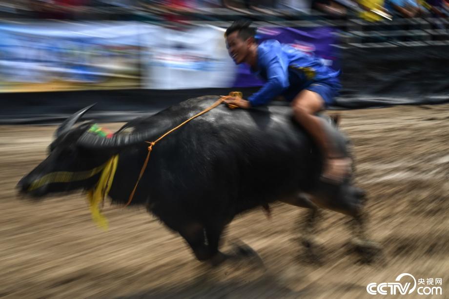 當(dāng)?shù)貢r(shí)間2019年10月12日,泰國(guó)春武里舉行一年一度的水牛賽跑,選手騎牛狂奔。視覺(jué)中國(guó)