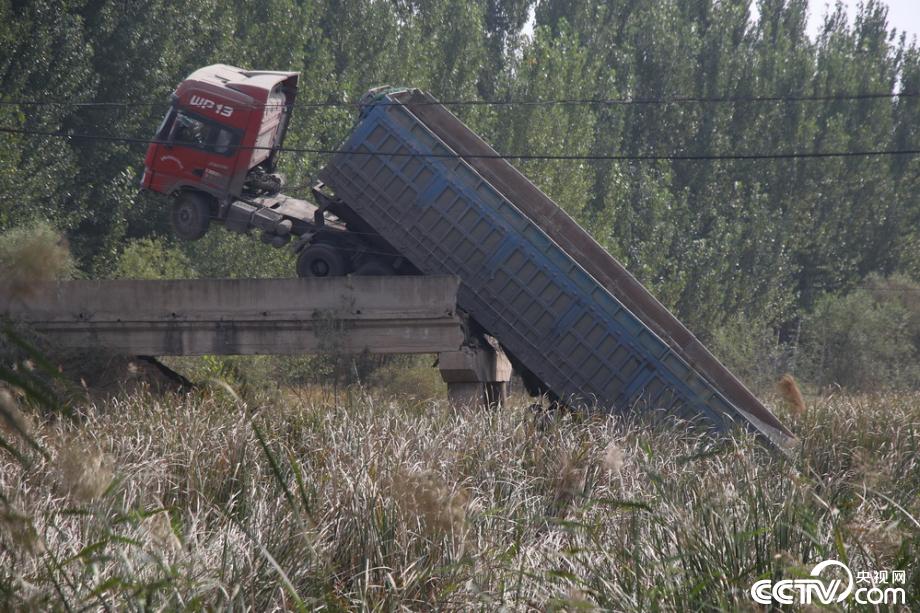 2019年10月13日,山東濱州,一輛滿載貨物的大貨車路過(guò)當(dāng)?shù)匾蛔鶎?米左右的小橋時(shí),致使橋面坍塌。據(jù)報(bào)道,13日凌晨4點(diǎn)左右,一輛重型半掛貨車沿渤海十八路由南向北行駛至市西辦事處李茂家村附近,右轉(zhuǎn)彎進(jìn)入連接渤海十八路與李茂家村村西鄉(xiāng)間路的一座寬4米左右的小橋時(shí),致使橋面坍塌?,F(xiàn)場(chǎng)貨車呈翹起之勢(shì),車頭懸于半空中,車尾插入水中,事故未造成人員傷亡。據(jù)現(xiàn)場(chǎng)了解,該橋建設(shè)于1974年,橋頭有警示標(biāo)識(shí),警示承載4噸。目前救援工作正在緊張有序地進(jìn)行中。視覺(jué)中國(guó)