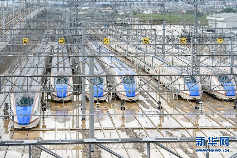10月14日,在日本長(zhǎng)野市,東日本鐵路公司長(zhǎng)野新干線車輛中心的新干線列車被洪水浸泡。受縱貫東日本強(qiáng)臺(tái)風(fēng)“海貝思”帶來(lái)的強(qiáng)降雨影響,日本多地暴發(fā)洪災(zāi),已造成33人死亡、19人失蹤。據(jù)日本共同社13日統(tǒng)計(jì),“海貝思”過(guò)境導(dǎo)致日本多處河流泛濫,目前有21條河流決堤24處。其中,流經(jīng)長(zhǎng)野縣的千曲川決堤,造成長(zhǎng)野市和千曲市大范圍被淹,大片住宅區(qū)被洪水包圍,有的房屋甚至被淹至2層。新華社記者華義攝