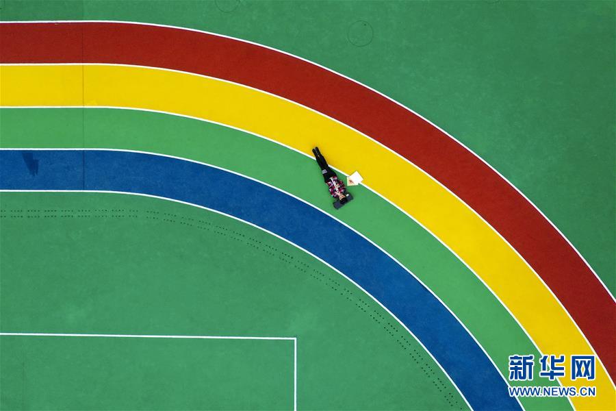 午休時(shí)間,王太樊在學(xué)校的操場上練習(xí)小號(hào)、背誦樂譜(10月10日無人機(jī)拍攝)。 新華社記者 劉潺 攝