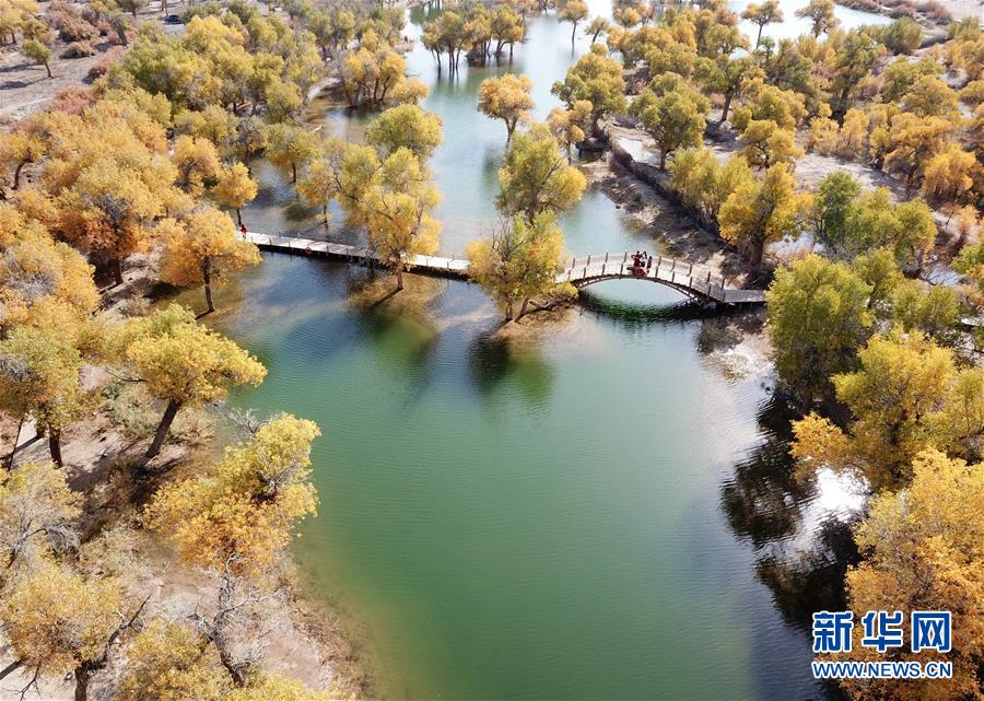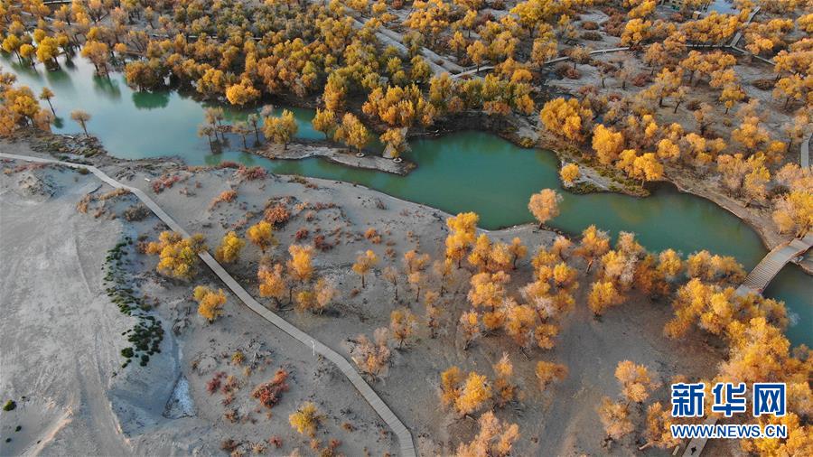 這是在內(nèi)蒙古自治區(qū)額濟(jì)納旗拍攝的胡楊林(10月10日無人機(jī)拍攝)。金秋時(shí)節(jié),內(nèi)蒙古自治區(qū)額濟(jì)納旗胡楊林如同披上金裝,成為大漠中的一抹亮色,吸引眾多中外游客前來觀賞游玩。新華社記者鄒予攝